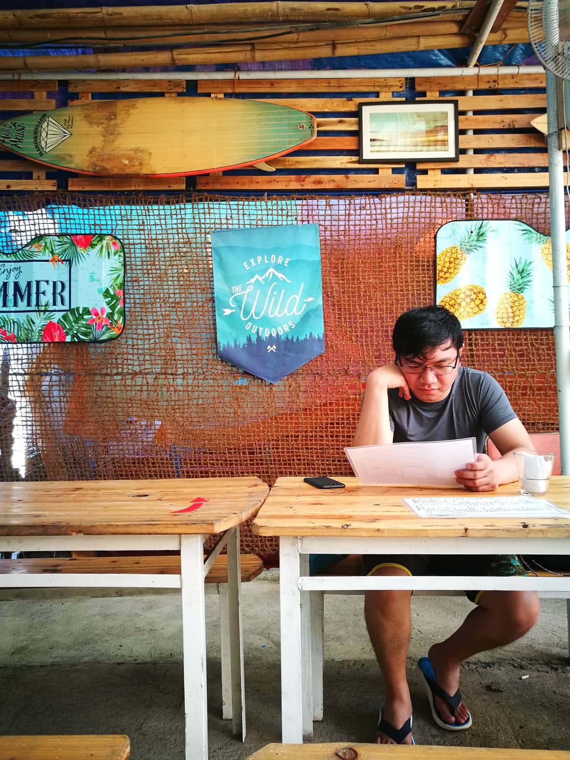 After an hour of their surf lessons at around 5pm, and me desperately not wanting to get wet from the water while taking photos, we went back as it started to rain. Since Kar had to work and Mai and Dane were a bit tired from surfing, so us 4 took the boat back to the other side of the beach and met up with the rest to sit down in one of the kubos to rest, while I was freezing cold despite not being dipped into the water.