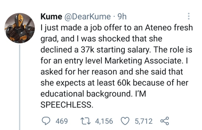 Recently, the tweet above went viral in many different social media platforms. It raised the question of whether or not this fresh grad was entitled, or that we live in a country where we’re so used to being underpaid that asserting our value means we’re too privileged.